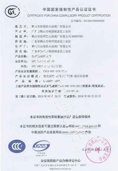 鶴山市恒保防火玻璃廠有限公司在陳總經理的領導下,跟全體員工的共同努力下,于2013年3月18日通過國家防火建筑材料質量監督檢驗中心的檢測,最終通過由公安部消防產品合格評定