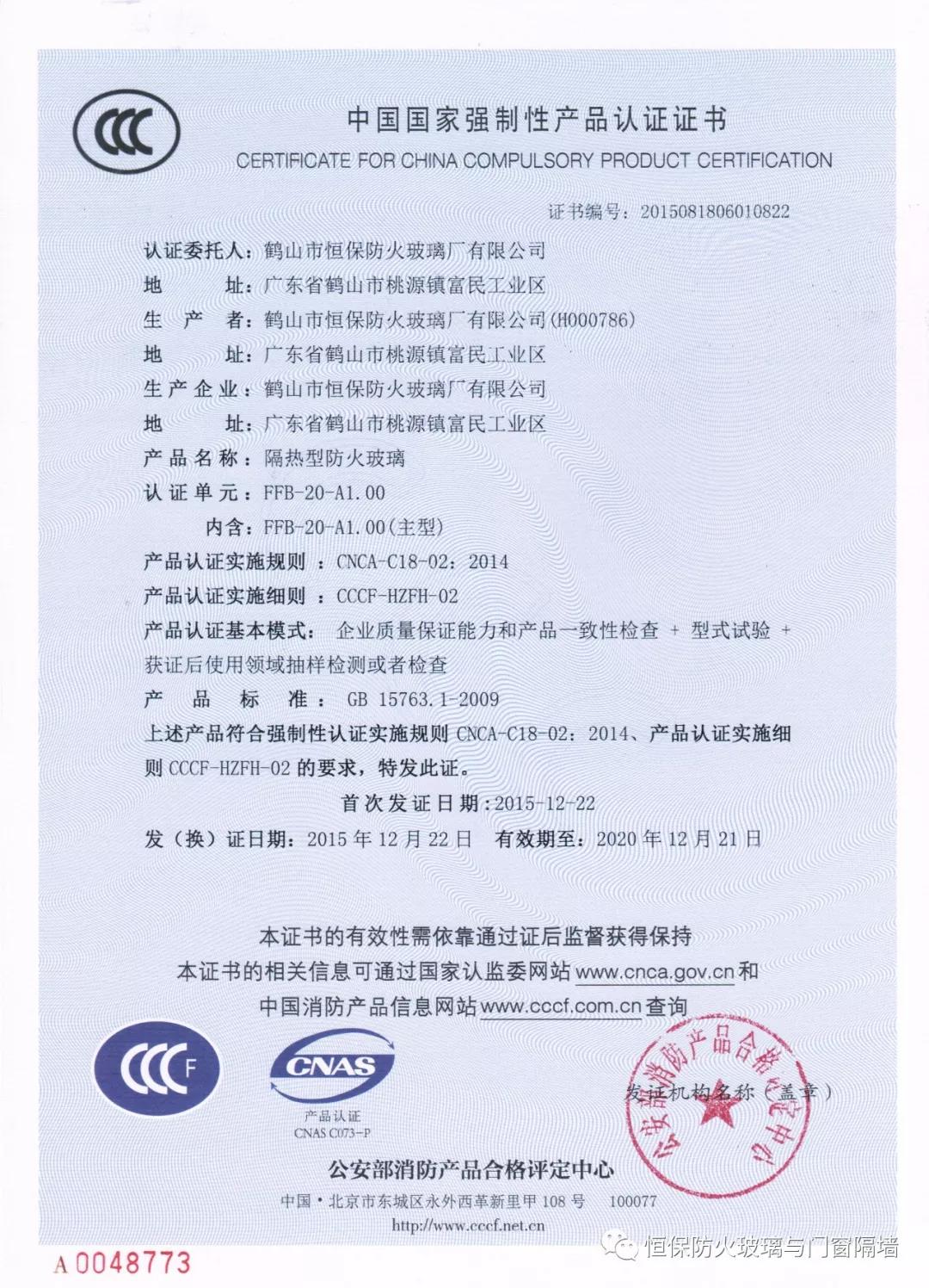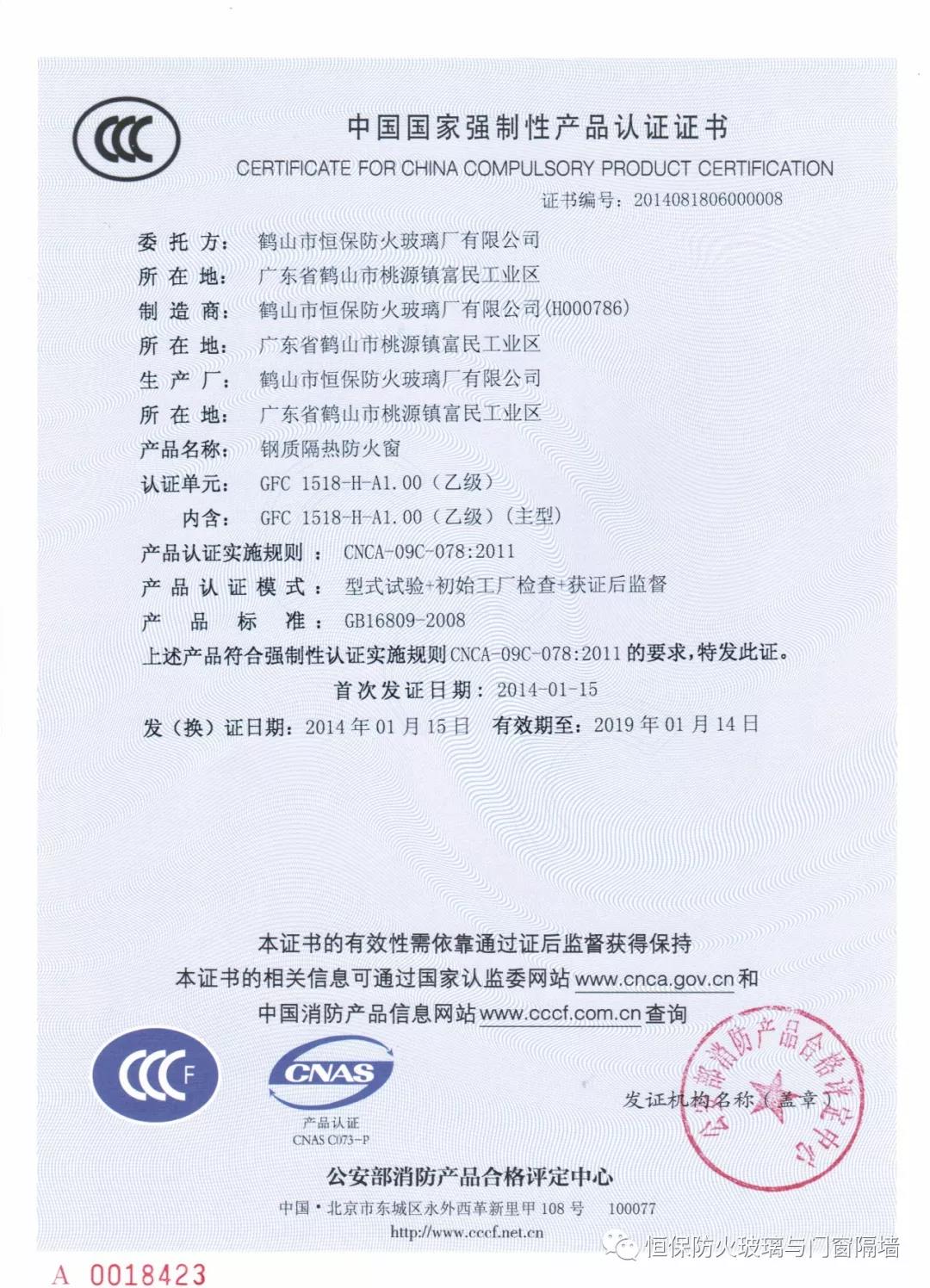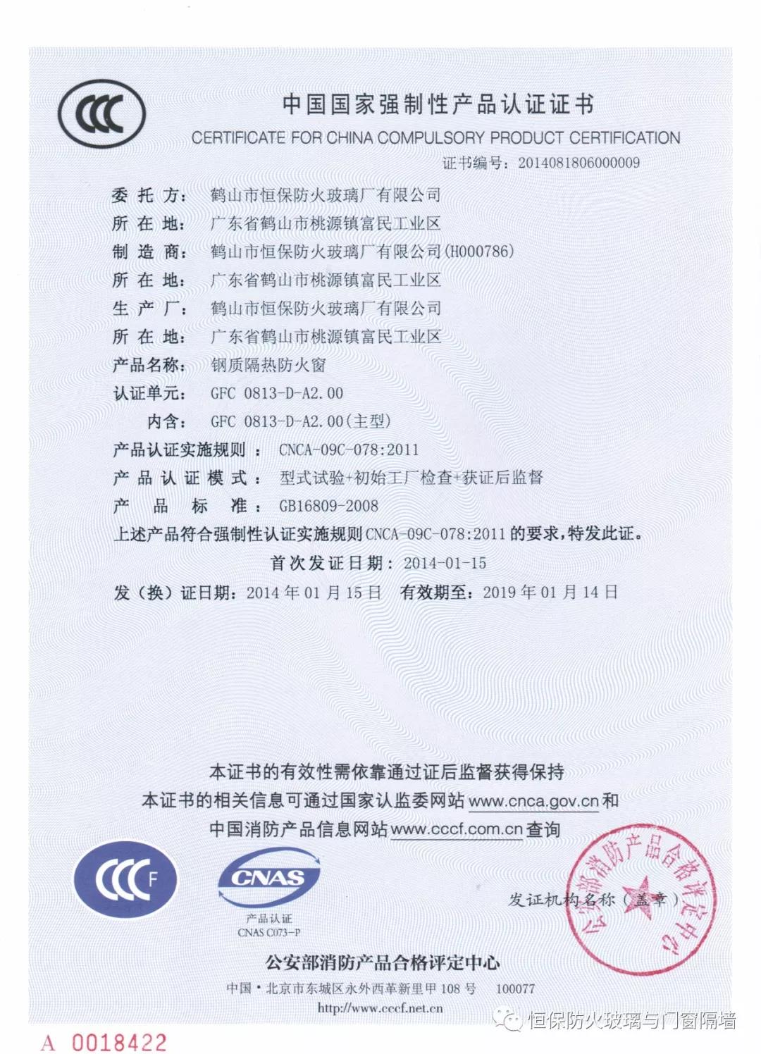 2)防火窗、防火門、防火玻璃非承重隔墻、擋煙垂壁等列入國家強(qiáng)制性認(rèn)證產(chǎn)品名錄的:需有CCC認(rèn)證證書和型式試驗報告;