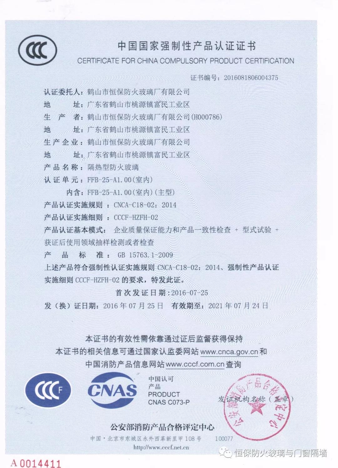 截至2017年7月,恒保已獲得國家“CCCf” 主型產(chǎn)品認(rèn)證證書31張,評定中心網(wǎng)上公告報告51份,四川中心公告11份,英標(biāo)、歐標(biāo)、澳標(biāo)、美標(biāo)報告29份評估報告18份,耐火窗報告4份,共計113份涵蓋0.5小時至4小時防火玻璃系列產(chǎn)品,防火玻璃與門窗類專利17項。