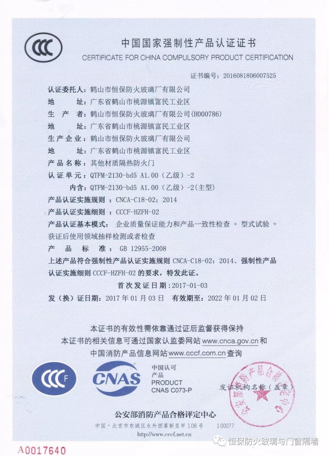 5、恒保公司一共6個產(chǎn)品獲得國家3C認(rèn)證證書,其中大版面玻璃防火門2100mmX3000mm;