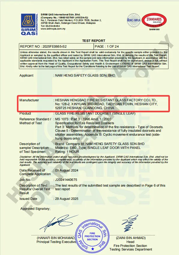 喜訊:恒保與馬來西亞南興玻璃集團共同研究開發EI60和EI120玻璃防火門帶間墻系統,并于馬來西亞科技創新與產業研究院(SIRIM Berhad)順利通過SIRIM認證。至此,恒保成為第一個EI120玻璃防火門帶間墻系統產品通過SIRIM認證的公司。恒保和南興玻璃集團共創輝煌,迎來新的里程碑!