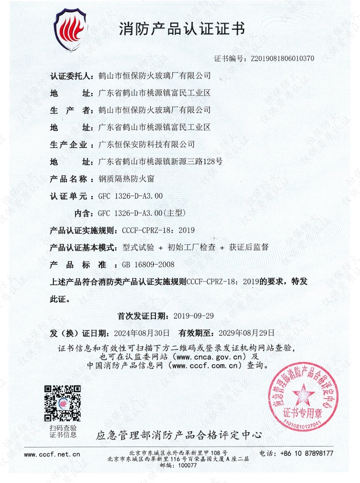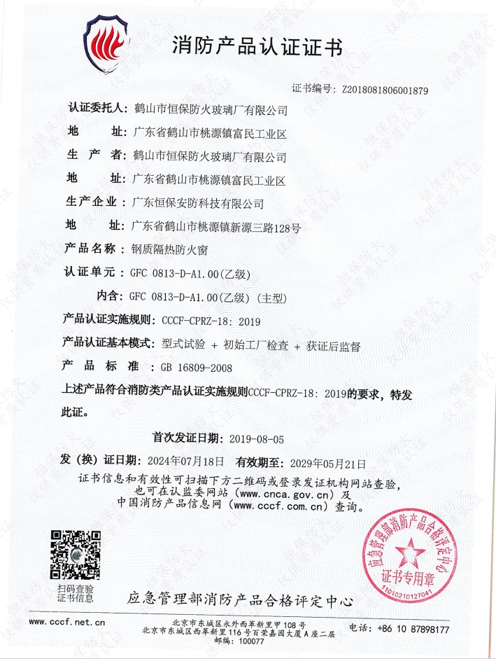 甲級固定防火窗消防產品認證證書: